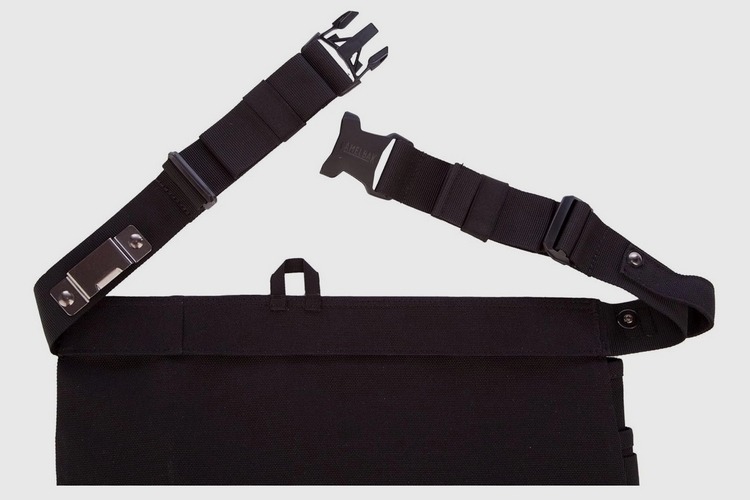 To the left of the pocket array sits a detachable hydration flask clad in the same rugged material as the rest of the tool belt. According to the outfit, the flask has a 17oz capacity, giving you enough refreshment to stay well-hydrated for a bit before needing a refill. The flask also gets a self-sealing bite valve and a wide opening large enough to let you drop in standard-sized ice cubes, as well as a metal belt clip and a D-ring, giving you plenty of options in mounting it to other gear (e.g. wear it on your leather belt, hook it to a lanyard).